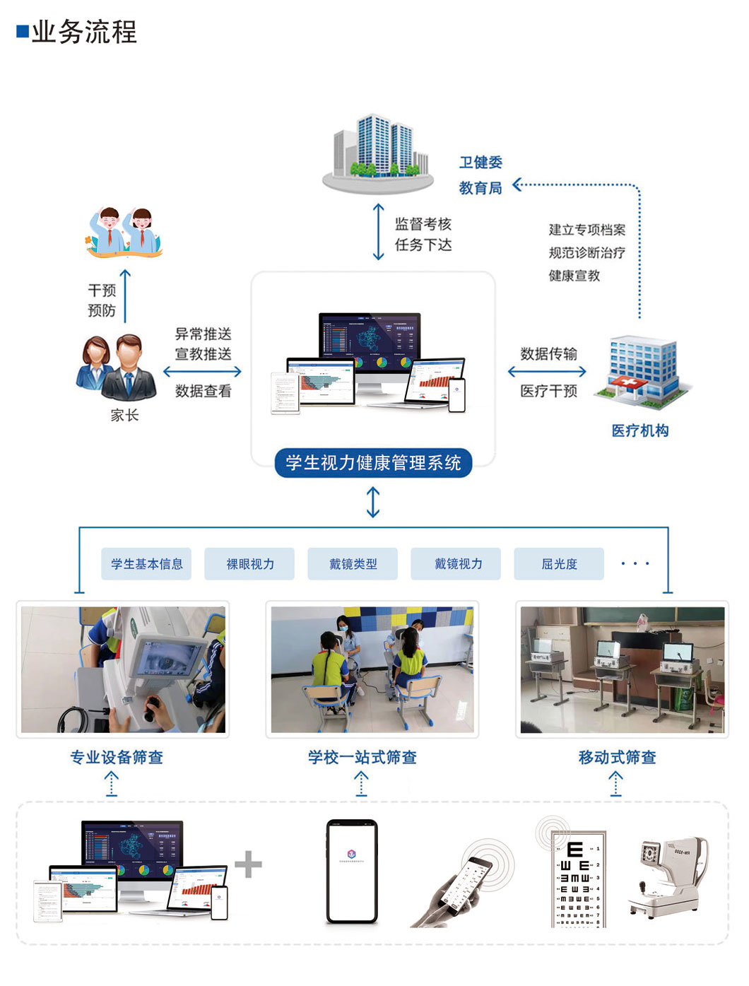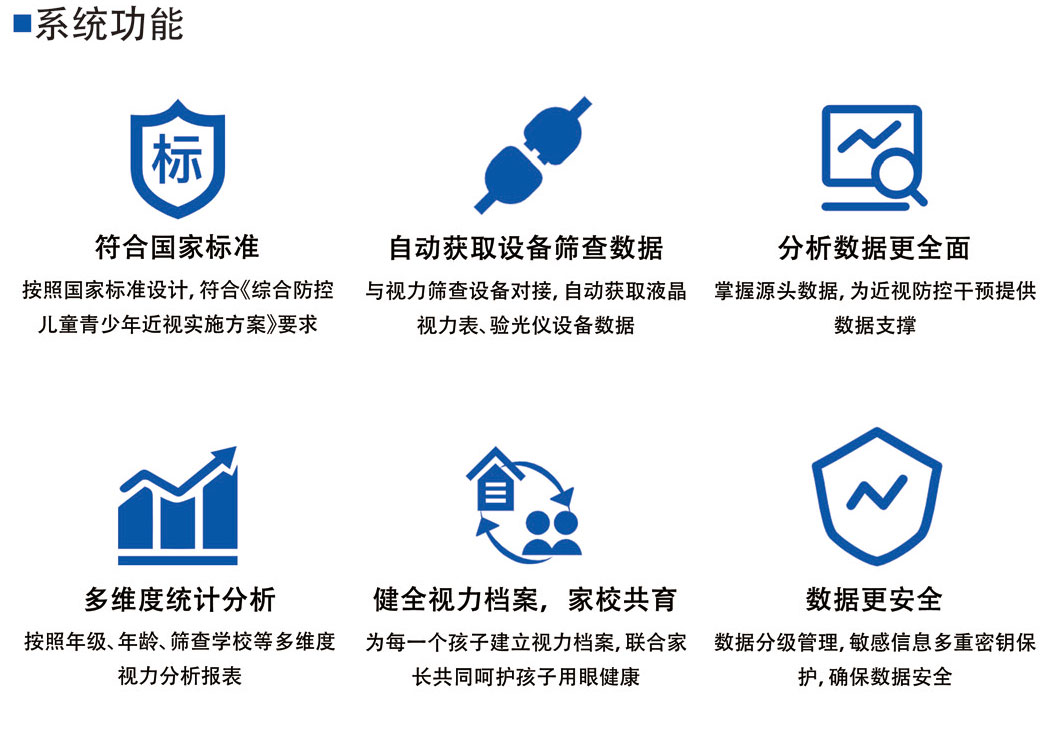 系統(tǒng)參照《兒童青少年近視篩查規(guī)范》要求設(shè)計(jì),符合 GB11533-2011 國(guó)家標(biāo)準(zhǔn),運(yùn)用互聯(lián)網(wǎng)、物聯(lián)網(wǎng)和移動(dòng)通信等技術(shù)為學(xué)生視力體檢并建立視力健康檔案。支持視力數(shù)據(jù)采集、查詢、評(píng)價(jià)、預(yù)警、統(tǒng)計(jì)、分析、存檔、診療、康復(fù)于一體,形成一個(gè)兒童青少年風(fēng)險(xiǎn)評(píng)估和分級(jí)預(yù)防信息化體系,實(shí)現(xiàn)兒童青少年眼健康的智能化和標(biāo)準(zhǔn)化篩查,提高兒童青少年眼健康數(shù)字化管理水平,滿足省、市、區(qū)縣三級(jí)監(jiān)管和考核要求,為深入制定近視防控方法、抑制兒童青少年近視高發(fā)、低齡化的趨勢(shì),提供科學(xué)數(shù)據(jù)支撐。